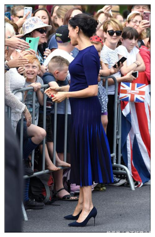 海军蓝是一种非常经典的颜色,代表着专业和干练。梅根选择了一款海军蓝衬衫裙,搭配同色色高跟鞋,展现出了职场女性的精英风范。衬衫裙的设计简约利落,腰间的腰带勾勒出她的身材曲线,同时也增加了造型的层次感。依旧不穿丝袜,营造出一种优雅而不失活力的氛围。