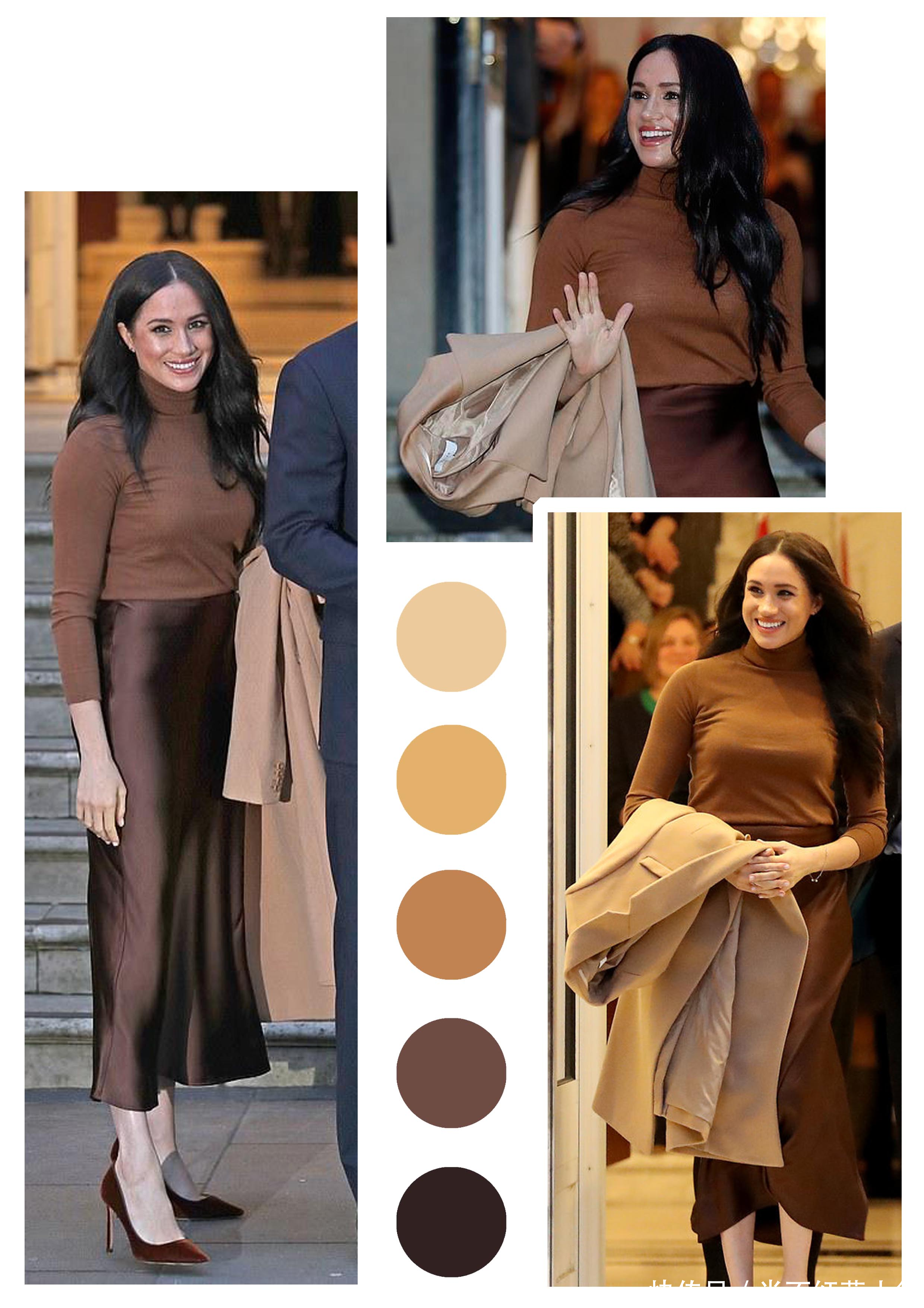 同色系搭配公式是最不易出错且极易穿出高级感的方法。日常中可以选择3个明度不同的同色单品进行组合,例如梅根这套咖色的同色系搭配就不错,色彩的渐变自然而富有层次,如针织的柔软、羊毛的挺括,这种不同材质的碰撞,更能在统一中见细节,彰显不俗品味。