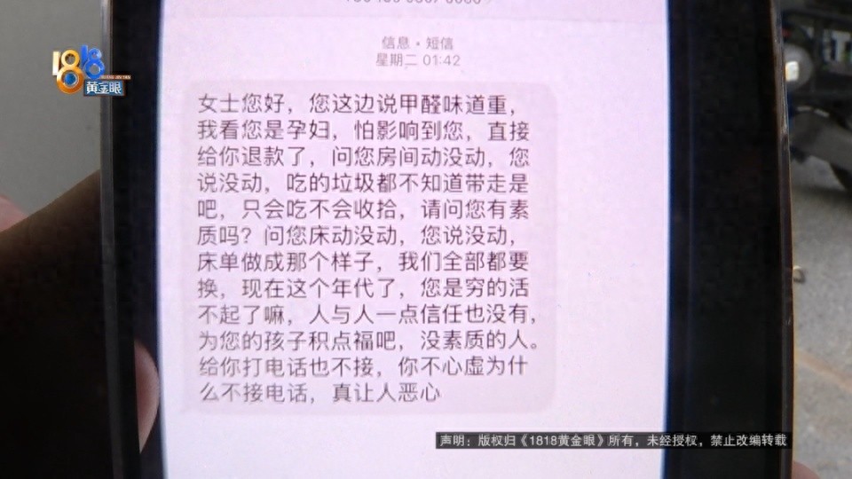 “女士您好,您这边说甲醛味道重,我看您是孕妇怕影响到您,直接给你退款了。问您房间动没动,您说没动,吃的垃圾都不知道带走是吧?只会吃不会收拾,请问您有素质吗?问您床动没动,您说没动,床单坐成那个样子,我们全部都要换,现在这个年代了,您是穷得活不起了嘛?人与人一点信任也没有。”