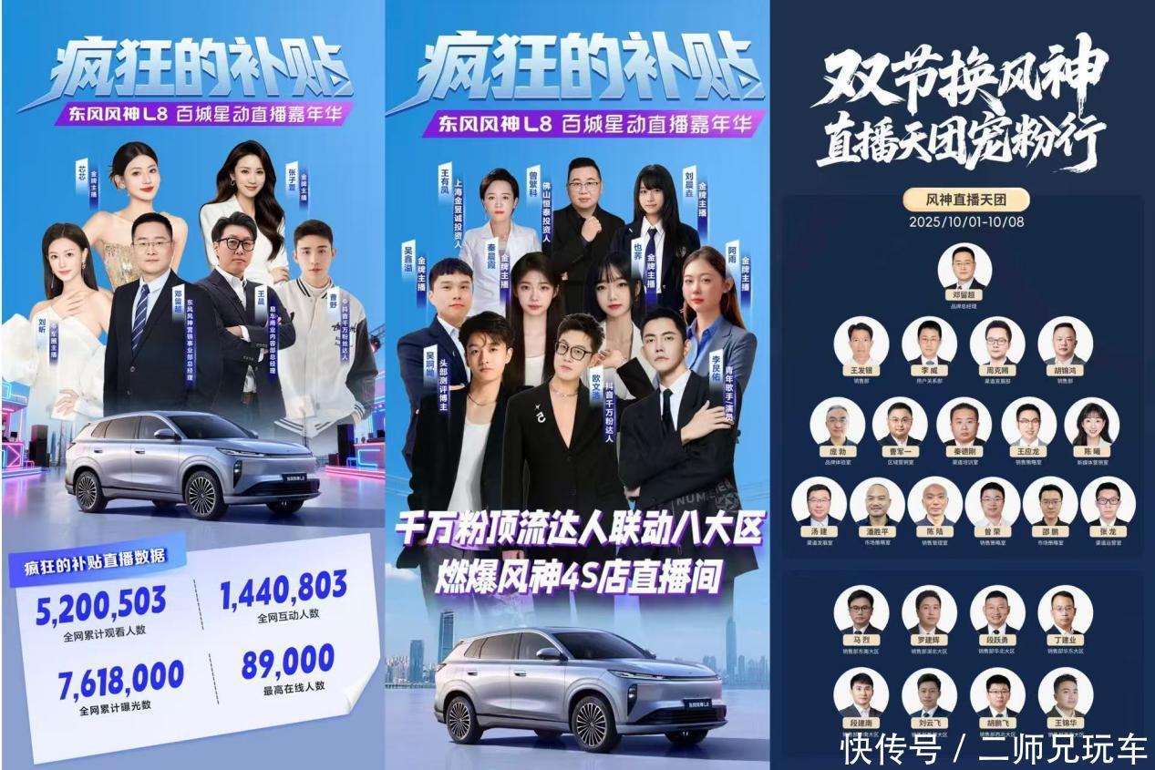 东风风神也同步启动“L8百城星动直播嘉年华”,构建三大直播矩阵,推动品效合一。总部层面,高管联合平台权威解读,集中锁定高意向用户;区域层面,千万粉达人联动门店实地直播,精准引导线下流量,实现高效转化,中高管直播天团全体下沉店端参与宠粉行动,打造一场“海陆空”协同的营销事件,以“卷流量”吸引关注,以“卷政策”促进留资,以“卷门店”提升转化,最终通过全域共振,高效赋能终端,实现高质量线索的显著增长与进店成交的强势拉升。